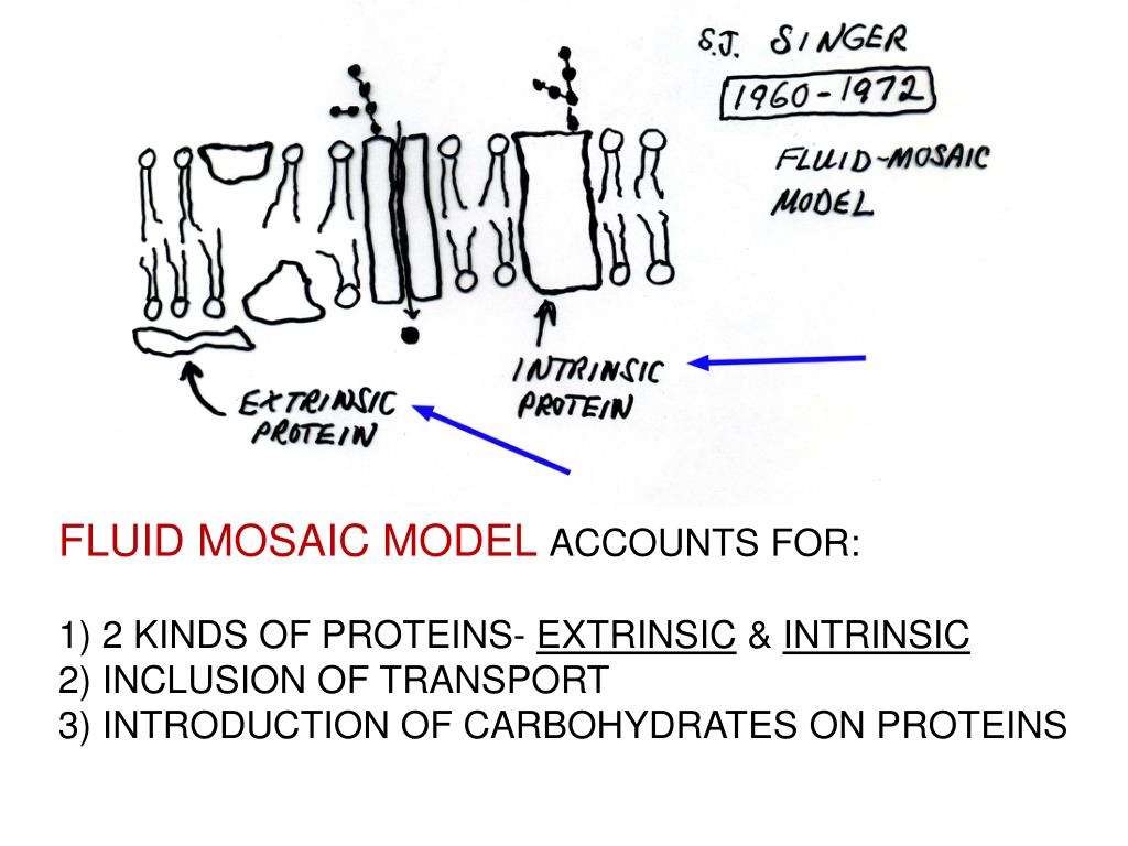 FLUID MOSAIC MODEL ACCOUNTS FOR: 1) 2 KINDS OF PROTEINS- EXTRINSIC & INTRINSIC 2) INCLUSION OF TRANSPORT 3) INTRODUCTION OF CARBOHYDRATES ON PROTEINS