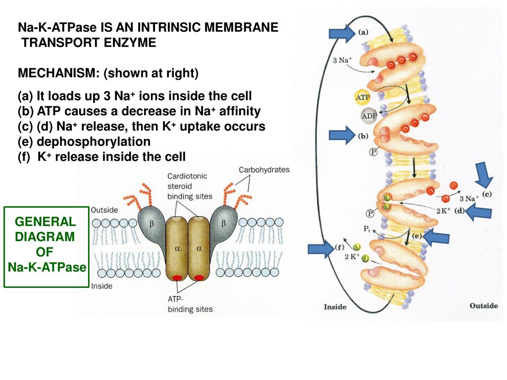 Na-K-ATPase IS AN INTRINSIC MEMBRANE TRANSPORT ENZYME MECHANISM: (shown at right) It loads up 3 Na+ ions inside the cell ATP causes a decrease in Na+ affinity (d) Na+ release, then K+ uptake occurs (e) dephosphorylation (f) K+ release inside the cell GENERAL DIAGRAM OF Na-K-ATPase