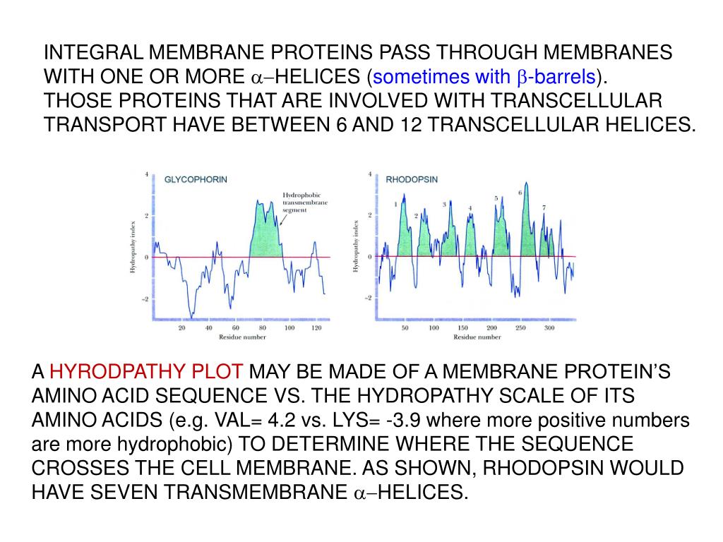 INTEGRAL MEMBRANE PROTEINS PASS THROUGH MEMBRANES WITH ONE OR MORE a-HELICES (sometimes with b-barrels). THOSE PROTEINS THAT ARE INVOLVED WITH TRANSCELLULAR TRANSPORT HAVE BETWEEN 6 AND 12 TRANSCELLULAR HELICES. A HYRODPATHY PLOT MAY BE MADE OF A MEMBRANE PROTEIN’S AMINO ACID SEQUENCE VS. THE HYDROPATHY SCALE OF ITS AMINO ACIDS (e.g. VAL= 4.2 vs. LYS= -3.9 where more positive numbers are more hydrophobic) TO DETERMINE WHERE THE SEQUENCE CROSSES THE CELL MEMBRANE. AS SHOWN, RHODOPSIN WOULD HAVE SEVEN TRANSMEMBRANE a-HELICES.
