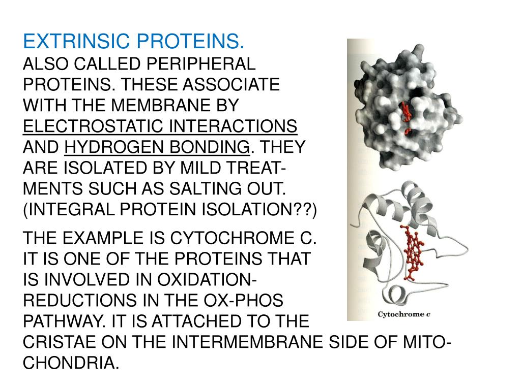 EXTRINSIC PROTEINS. ALSO CALLED PERIPHERAL PROTEINS. THESE ASSOCIATE WITH THE MEMBRANE BY ELECTROSTATIC INTERACTIONS AND HYDROGEN BONDING. THEY ARE ISOLATED BY MILD TREAT- MENTS SUCH AS SALTING OUT. (INTEGRAL PROTEIN ISOLATION??) THE EXAMPLE IS CYTOCHROME C. IT IS ONE OF THE PROTEINS THAT IS INVOLVED IN OXIDATION- REDUCTIONS IN THE OX-PHOS PATHWAY. IT IS ATTACHED TO THE CRISTAE ON THE INTERMEMBRANE SIDE OF MITO- CHONDRIA.