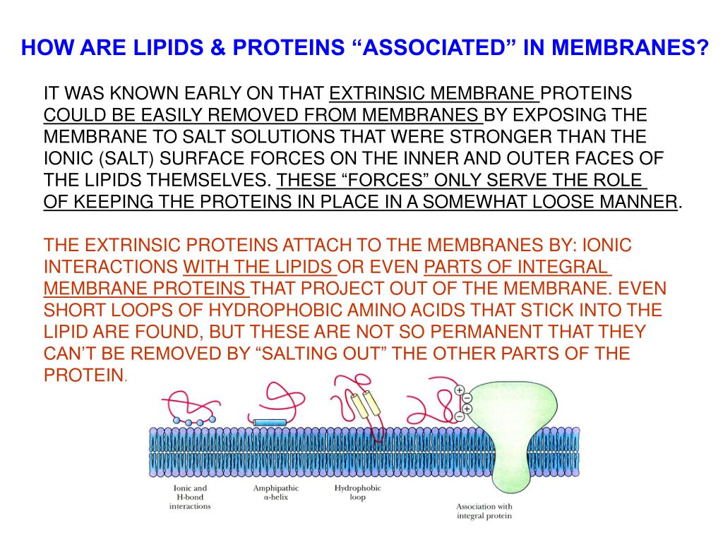 HOW ARE LIPIDS & PROTEINS “ASSOCIATED” IN MEMBRANES? IT WAS KNOWN EARLY ON THAT EXTRINSIC MEMBRANE PROTEINS COULD BE EASILY REMOVED FROM MEMBRANES BY EXPOSING THE MEMBRANE TO SALT SOLUTIONS THAT WERE STRONGER THAN THE IONIC (SALT) SURFACE FORCES ON THE INNER AND OUTER FACES OF THE LIPIDS THEMSELVES. THESE “FORCES” ONLY SERVE THE ROLE OF KEEPING THE PROTEINS IN PLACE IN A SOMEWHAT LOOSE MANNER. THE EXTRINSIC PROTEINS ATTACH TO THE MEMBRANES BY: IONIC INTERACTIONS WITH THE LIPIDS OR EVEN PARTS OF INTEGRAL MEMBRANE PROTEINS THAT PROJECT OUT OF THE MEMBRANE. EVEN SHORT LOOPS OF HYDROPHOBIC AMINO ACIDS THAT STICK INTO THE LIPID ARE FOUND, BUT THESE ARE NOT SO PERMANENT THAT THEY CAN’T BE REMOVED BY “SALTING OUT” THE OTHER PARTS OF THE PROTEIN.