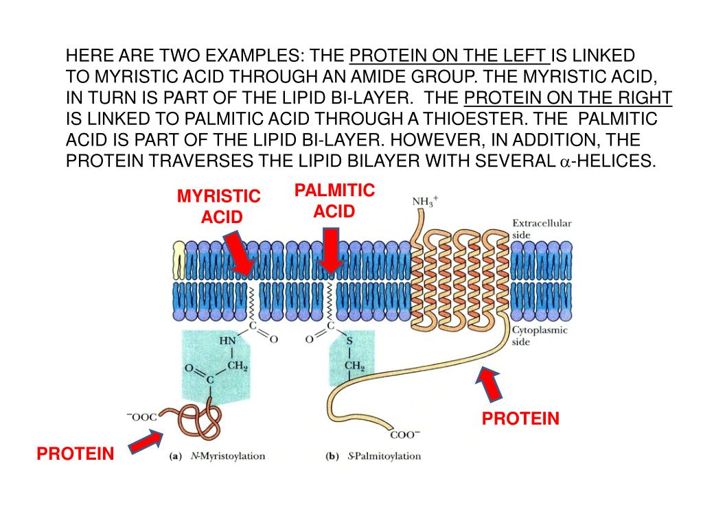 HERE ARE TWO EXAMPLES: THE PROTEIN ON THE LEFT IS LINKED TO MYRISTIC ACID THROUGH AN AMIDE GROUP. THE MYRISTIC ACID, IN TURN IS PART OF THE LIPID BI-LAYER. THE PROTEIN ON THE RIGHT IS LINKED TO PALMITIC ACID THROUGH A THIOESTER. THE PALMITIC ACID IS PART OF THE LIPID BI-LAYER. HOWEVER, IN ADDITION, THE PROTEIN TRAVERSES THE LIPID BILAYER WITH SEVERAL a-HELICES. PALMITIC ACID MYRISTIC ACID PROTEIN PROTEIN