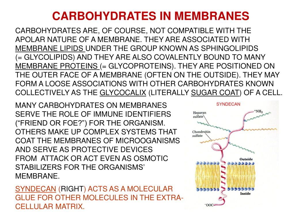 CARBOHYDRATES IN MEMBRANES CARBOHYDRATES ARE, OF COURSE, NOT COMPATIBLE WITH THE APOLAR NATURE OF A MEMBRANE. THEY ARE ASSOCIATED WITH MEMBRANE LIPIDS UNDER THE GROUP KNOWN AS SPHINGOLIPIDS (= GLYCOLIPIDS) AND THEY ARE ALSO COVALENTLY BOUND TO MANY MEMBRANE PROTEINS (= GLYCOPROTEINS). THEY ARE POSITIONED ON THE OUTER FACE OF A MEMBRANE (OFTEN ON THE OUTSIDE). THEY MAY FORM A LOOSE ASSOCIATIONS WITH OTHER CARBOHYDRATES KNOWN COLLECTIVELY AS THE GLYCOCALIX (LITERALLY SUGAR COAT) OF A CELL. MANY CARBOHYDRATES ON MEMBRANES SERVE THE ROLE OF IMMUNE IDENTIFIERS (“FRIEND OR FOE?”) FOR THE ORGANISM. OTHERS MAKE UP COMPLEX SYSTEMS THAT COAT THE MEMBRANES OF MICROOGANISMS AND SERVE AS PROTECTIVE DEVICES FROM ATTACK OR ACT EVEN AS OSMOTIC STABILIZERS FOR THE ORGANISMS’ MEMBRANE. SYNDECAN (RIGHT) ACTS AS A MOLECULAR GLUE FOR OTHER MOLECULES IN THE EXTRA- CELLULAR MATRIX.