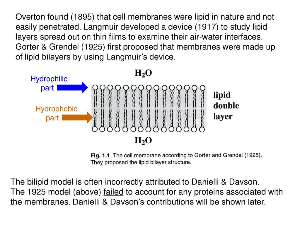 Overton found (1895) that cell membranes were lipid in nature and not easily penetrated. Langmuir developed a device (1917) to study lipid layers spread out on thin films to examine their air-water interfaces. Gorter & Grendel (1925) first proposed that membranes were made up of lipid bilayers by using Langmuir’s device. Hydrophilic part Hydrophobic part The bilipid model is often incorrectly attributed to Danielli & Davson. The 1925 model (above) failed to account for any proteins associated with the membranes. Danielli & Davson’s contributions will be shown later.