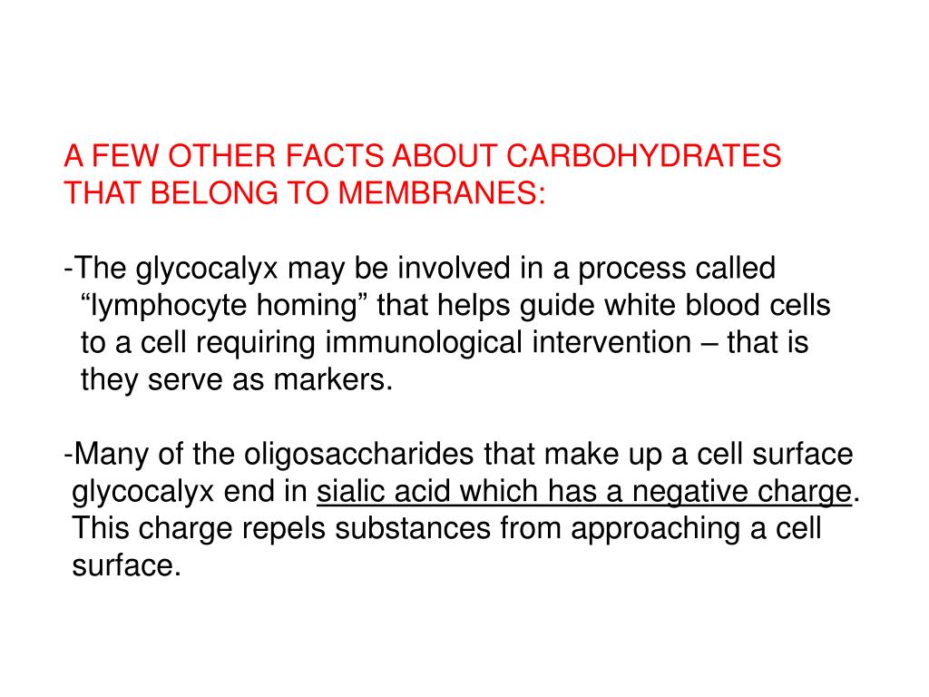 A FEW OTHER FACTS ABOUT CARBOHYDRATES • THAT BELONG TO MEMBRANES: • The glycocalyx may be involved in a process called • “lymphocyte homing” that helps guide white blood cells • to a cell requiring immunological intervention – that is • they serve as markers. • -Many of the oligosaccharides that make up a cell surface • glycocalyx end in sialic acid which has a negative charge. • This charge repels substances from approaching a cell • surface.