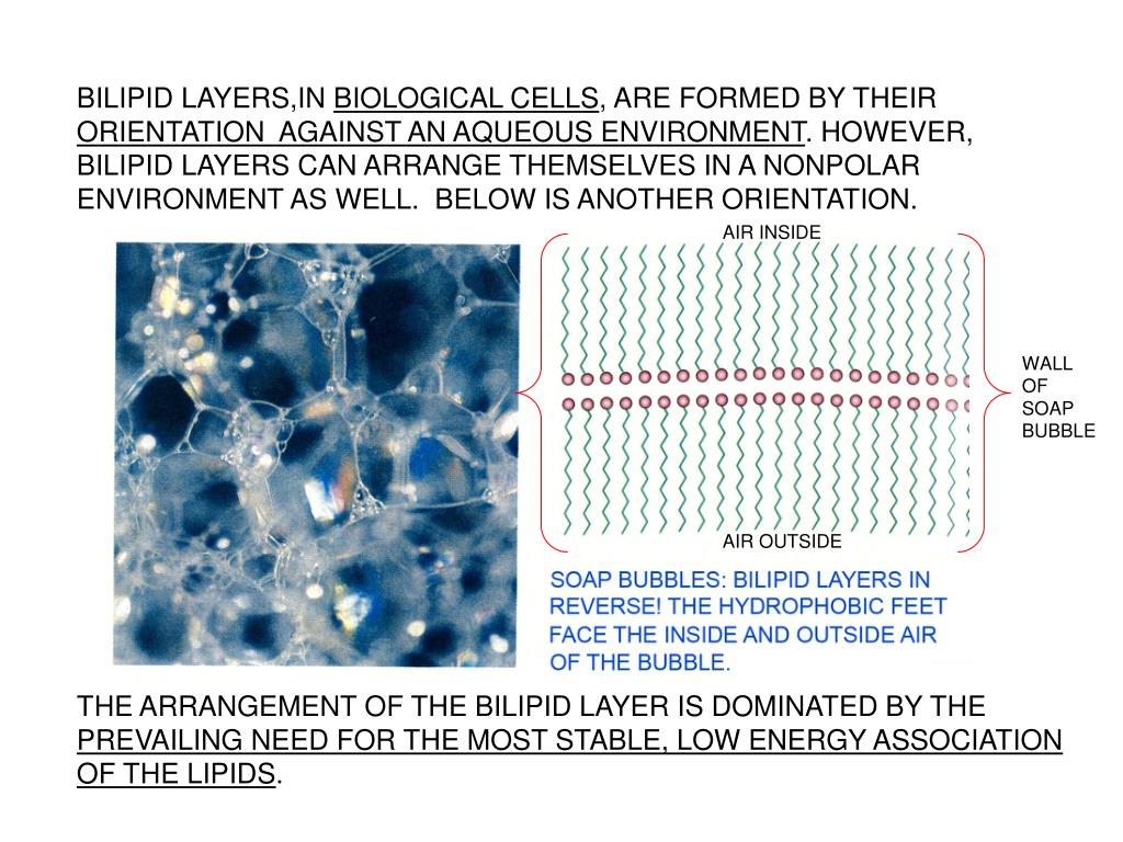 BILIPID LAYERS,IN BIOLOGICAL CELLS, ARE FORMED BY THEIR ORIENTATION AGAINST AN AQUEOUS ENVIRONMENT. HOWEVER, BILIPID LAYERS CAN ARRANGE THEMSELVES IN A NONPOLAR ENVIRONMENT AS WELL. BELOW IS ANOTHER ORIENTATION. AIR INSIDE WALL OF SOAP BUBBLE AIR OUTSIDE THE ARRANGEMENT OF THE BILIPID LAYER IS DOMINATED BY THE PREVAILING NEED FOR THE MOST STABLE, LOW ENERGY ASSOCIATION OF THE LIPIDS.
