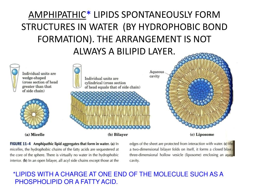 AMPHIPATHIC* LIPIDS SPONTANEOUSLY FORM STRUCTURES IN WATER (BY HYDROPHOBIC BOND FORMATION). THE ARRANGEMENT IS NOTALWAYS A BILIPID LAYER. *LIPIDS WITH A CHARGE AT ONE END OF THE MOLECULE SUCH AS A PHOSPHOLIPID OR A FATTY ACID.