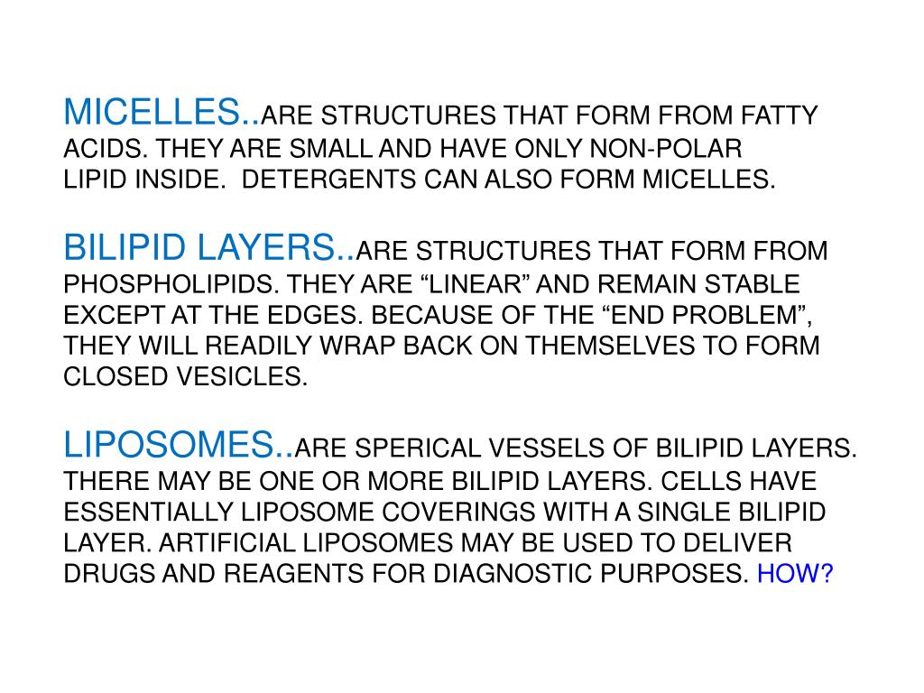 MICELLES..ARE STRUCTURES THAT FORM FROM FATTY ACIDS. THEY ARE SMALL AND HAVE ONLY NON-POLAR LIPID INSIDE. DETERGENTS CAN ALSO FORM MICELLES. BILIPID LAYERS..ARE STRUCTURES THAT FORM FROM PHOSPHOLIPIDS. THEY ARE “LINEAR” AND REMAIN STABLE EXCEPT AT THE EDGES. BECAUSE OF THE “END PROBLEM”, THEY WILL READILY WRAP BACK ON THEMSELVES TO FORM CLOSED VESICLES. LIPOSOMES..ARE SPERICAL VESSELS OF BILIPID LAYERS. THERE MAY BE ONE OR MORE BILIPID LAYERS. CELLS HAVE ESSENTIALLY LIPOSOME COVERINGS WITH A SINGLE BILIPID LAYER. ARTIFICIAL LIPOSOMES MAY BE USED TO DELIVER DRUGS AND REAGENTS FOR DIAGNOSTIC PURPOSES. HOW?