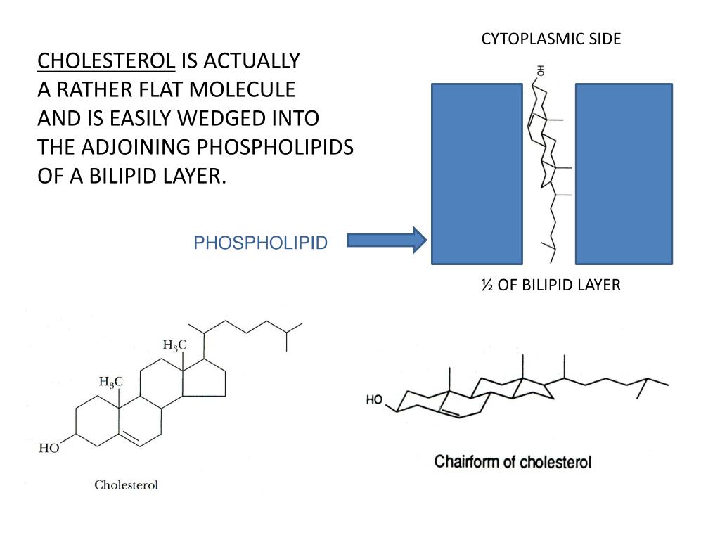 CYTOPLASMIC SIDE CHOLESTEROL IS ACTUALLY A RATHER FLAT MOLECULE AND IS EASILY WEDGED INTO THE ADJOINING PHOSPHOLIPIDS OF A BILIPID LAYER. PHOSPHOLIPID ½ OF BILIPID LAYER