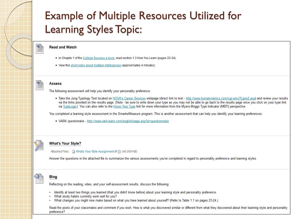 Example of Multiple Resources Utilized for Learning Styles Topic: