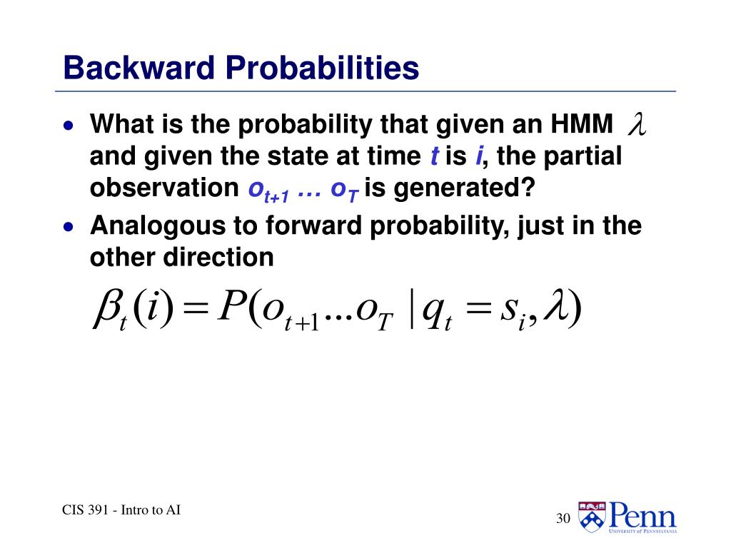 Backward Probabilities • What is the probability that given an HMM and given the state at time t is i, the partial observation ot+1 … oTis generated? • Analogous to forward probability, just in the other direction
