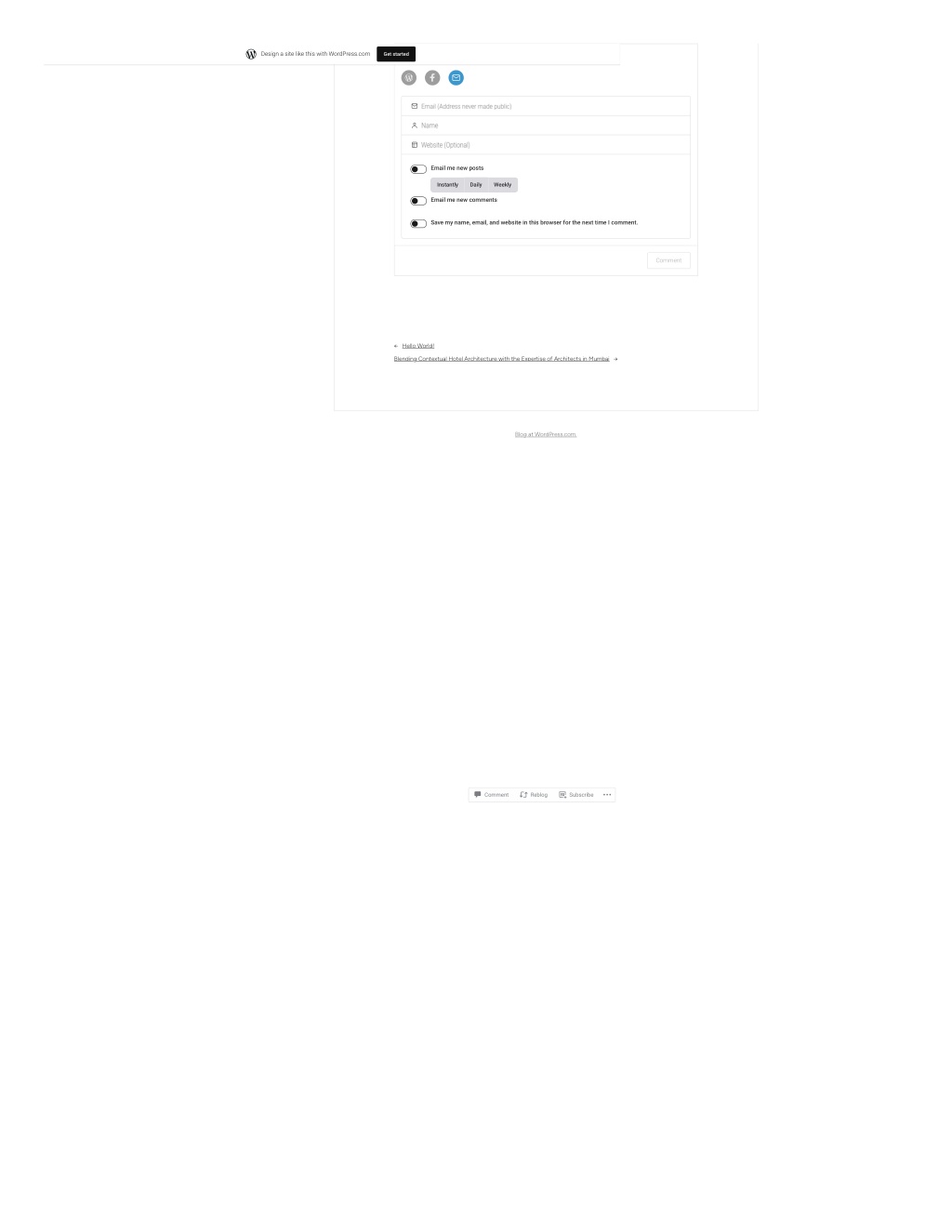 2. Design a site like this with WordPress.com Get started Log in or provide your name and email to leave a comment. Email me new posts Instantly Daily Weekly Email me new comments Save my name, email, and website in this browser for the next time I comment. Comment ← Hello World! Blending Contextual Hotel Architecture with the Expertise of Architects in Mumbai → Blog at WordPress.com. Comment Reblog Subscribe