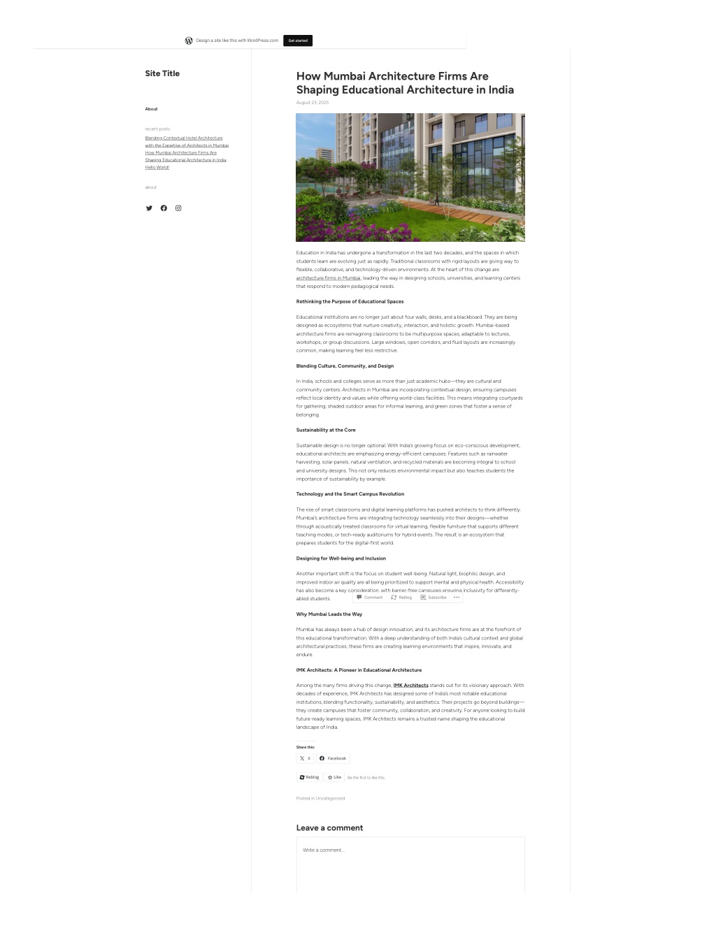 1. Design a site like this with WordPress.com Get started Site Title How Mumbai Architecture Firms Are Shaping Educational Architecture in India August 23, 2025 About recent posts Blending Contextual Hotel Architecture with the Expertise of Architects in Mumbai How Mumbai Architecture Firms Are Shaping Educational Architecture in India Hello World! about Education in India has undergone a transformation in the last two decades, and the spaces in which students learn are evolving just as rapidly. Traditional classrooms with rigid layouts are giving way to flexible, collaborative, and technology-driven environments. At the heart of this change are architecture firms in Mumbai, leading the way in designing schools, universities, and learning centers that respond to modern pedagogical needs. Rethinking the Purpose of Educational Spaces Educational institutions are no longer just about four walls, desks, and a blackboard. They are being designed as ecosystems that nurture creativity, interaction, and holistic growth. Mumbai-based architecture firms are reimagining classrooms to be multipurpose spaces, adaptable to lectures, workshops, or group discussions. Large windows, open corridors, and fluid layouts are increasingly common, making learning feel less restrictive. Blending Culture, Community, and Design In India, schools and colleges serve as more than just academic hubs—they are cultural and community centers. Architects in Mumbai are incorporating contextual design, ensuring campuses reflect local identity and values while offering world-class facilities. This means integrating courtyards for gathering, shaded outdoor areas for informal learning, and green zones that foster a sense of belonging. Sustainability at the Core Sustainable design is no longer optional. With India’s growing focus on eco-conscious development, educational architects are emphasizing energy-efficient campuses. Features such as rainwater harvesting, solar panels, natural ventilation, and recycled materials are becoming integral to school and university designs. This not only reduces environmental impact but also teaches students the importance of sustainability by example. Technology and the Smart Campus Revolution The rise of smart classrooms and digital learning platforms has pushed architects to think differently. Mumbai’s architecture firms are integrating technology seamlessly into their designs—whether through acoustically treated classrooms for virtual learning, flexible furniture that supports different teaching modes, or tech-ready auditoriums for hybrid events. The result is an ecosystem that prepares students for the digital-first world. Designing for Well-being and Inclusion Another important shift is the focus on student well-being. Natural light, biophilic design, and improved indoor air quality are all being prioritized to support mental and physical health. Accessibility has also become a key consideration, with barrier-free campuses ensuring inclusivity for differently- abled students. Comment Reblog Subscribe Why Mumbai Leads the Way Mumbai has always been a hub of design innovation, and its architecture firms are at the forefront of this educational transformation. With a deep understanding of both India’s cultural context and global architectural practices, these firms are creating learning environments that inspire, innovate, and endure. IMK Architects: A Pioneer in Educational Architecture Among the many firms driving this change, IMK Architects stands out for its visionary approach. With decades of experience, IMK Architects has designed some of India’s most notable educational institutions, blending functionality, sustainability, and aesthetics. Their projects go beyond buildings— they create campuses that foster community, collaboration, and creativity. For anyone looking to build future-ready learning spaces, IMK Architects remains a trusted name shaping the educational landscape of India. Share this:  Facebook  X Reblog Like Be the first to like this. Posted in Uncategorized Leave a comment Write a comment...