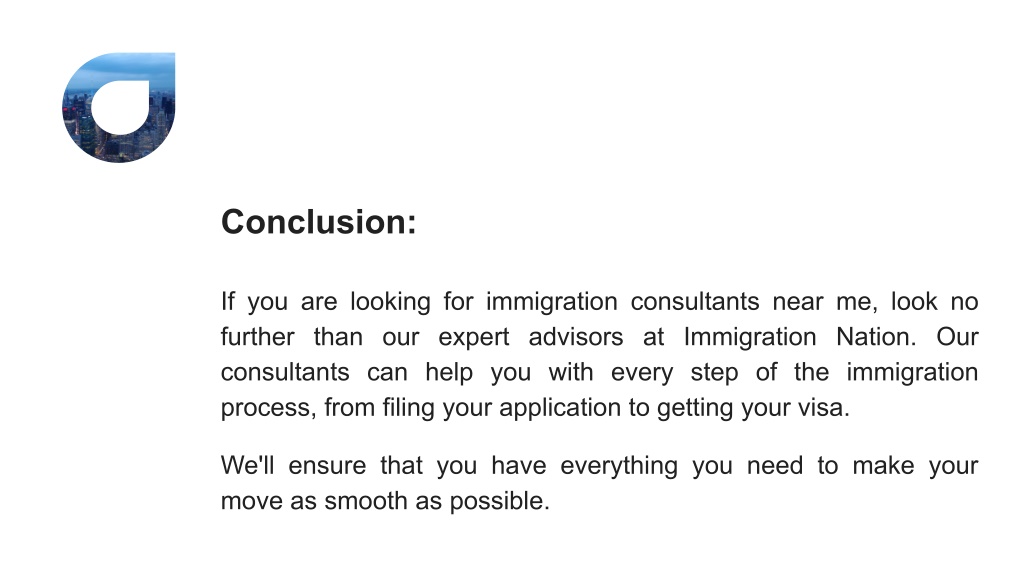 Conclusion: If you are looking for immigration consultants near me, look no further than our expert advisors at Immigration Nation. Our consultants can help you with every step of the immigration process, from filing your application to getting your visa. We'll ensure that you have everything you need to make your move as smooth as possible.