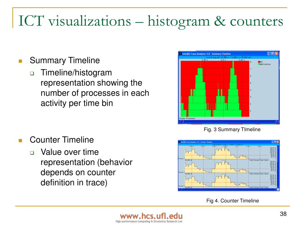 ICT visualizations – histogram & counters • Summary Timeline • Timeline/histogram representation showing the number of processes in each activity per time bin • Counter Timeline • Value over time representation (behavior depends on counter definition in trace) Fig. 3 Summary TImeline Fig 4. Counter Timeline