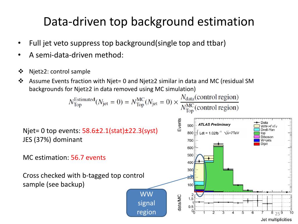 Data-driven top background estimation • Full jet veto suppress top background(single top and ttbar) • A semi-data-driven method: • Njet≥2: control sample • Assume Events fraction with Njet= 0 and Njet≥2 similar in data and MC (residual SM backgrounds for Njet≥2 in data removed using MC simulation) Njet= 0 top events: 58.6±2.1(stat)±22.3(syst) JES (37%) dominant MC estimation: 56.7 events Cross checked with b-tagged top control sample (see backup) WW signal region