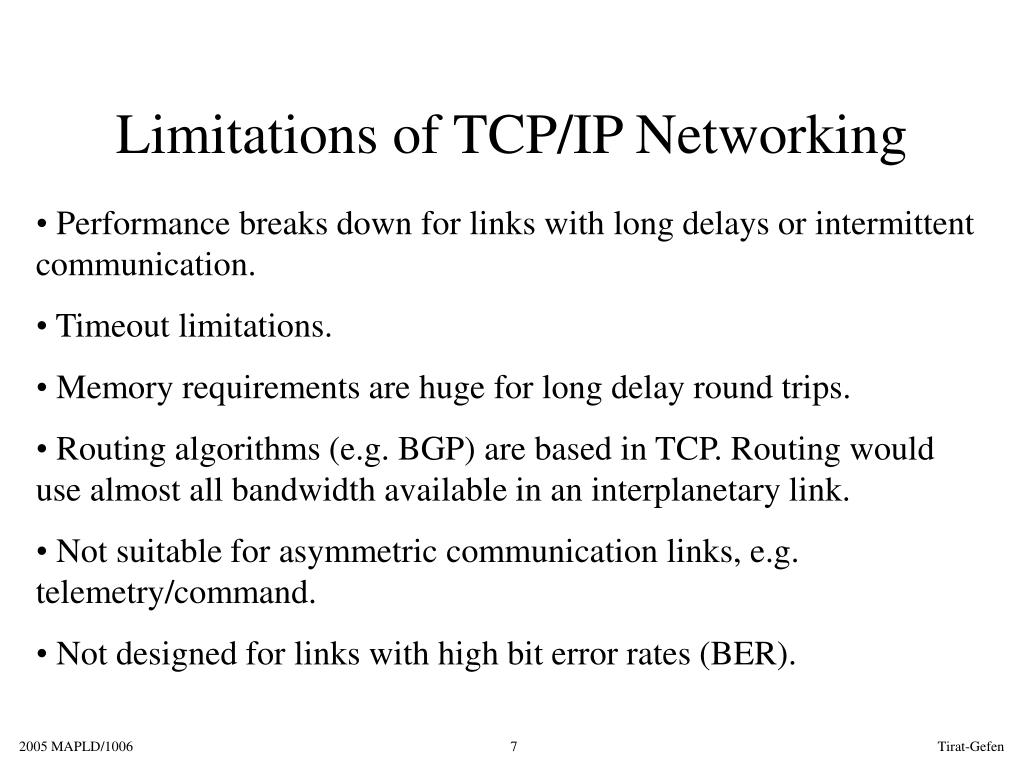 Limitations of TCP/IP Networking • Performance breaks down for links with long delays or intermittent communication. • Timeout limitations. • Memory requirements are huge for long delay round trips. • Routing algorithms (e.g. BGP) are based in TCP. Routing would use almost all bandwidth available in an interplanetary link. • Not suitable for asymmetric communication links, e.g. telemetry/command. • Not designed for links with high bit error rates (BER).