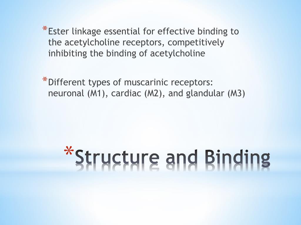 Ester linkage essential for effective binding to the acetylcholine receptors, competitively inhibiting the binding of acetylcholine • Different types of muscarinic receptors: neuronal (M1), cardiac (M2), and glandular (M3) Structure and Binding