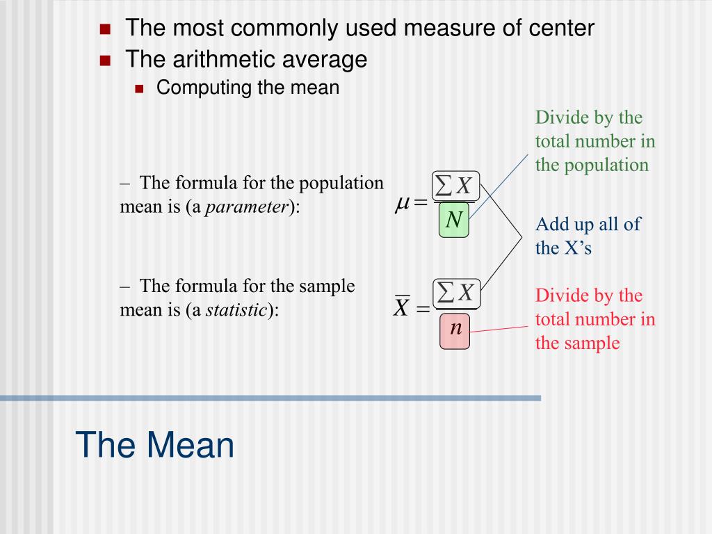 Divide by the total number in the population Add up all of the X’s Divide by the total number in the sample • The most commonly used measure of center • The arithmetic average • Computing the mean • The formula for the population mean is (a parameter): • The formula for the sample mean is (a statistic): The Mean