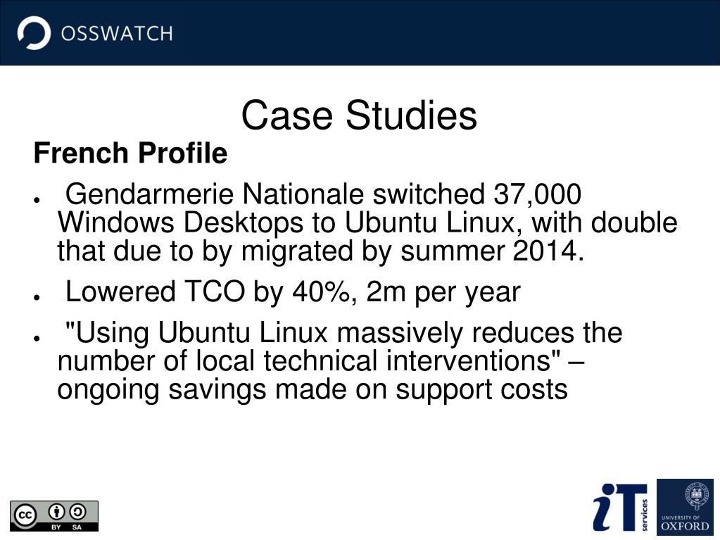 Case Studies French Profile • Gendarmerie Nationale switched 37,000 Windows Desktops to Ubuntu Linux, with double that due to by migrated by summer 2014. • Lowered TCO by 40%, 2m per year • "Using Ubuntu Linux massively reduces the number of local technical interventions" – ongoing savings made on support costs