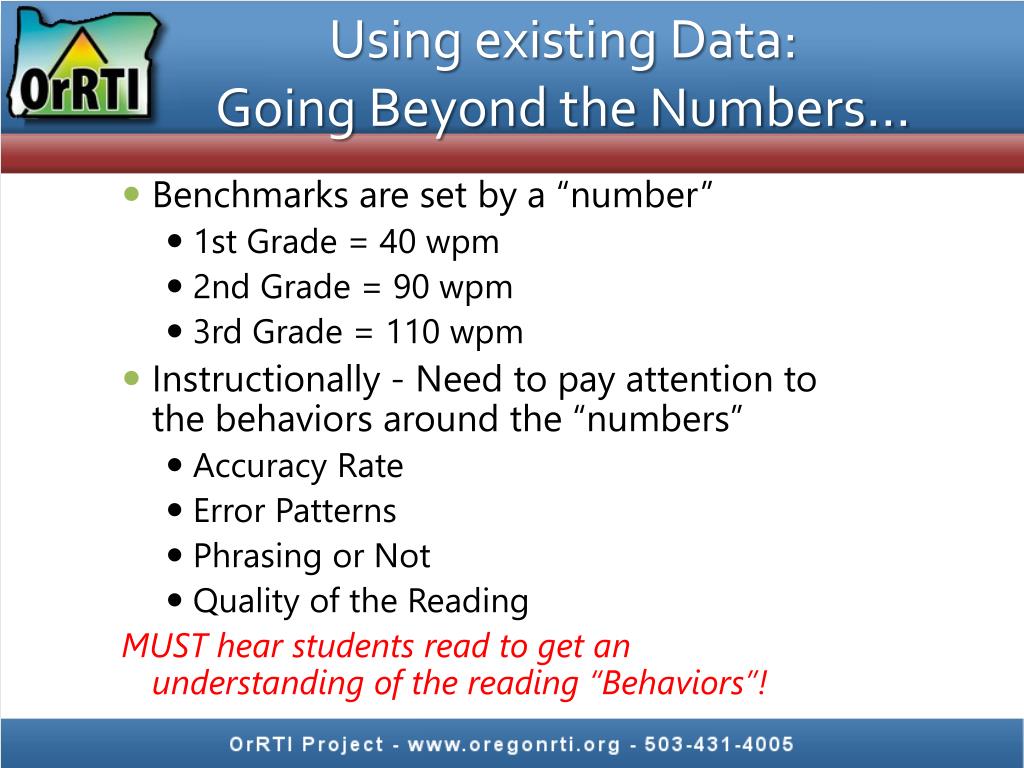 Using existing Data:Going Beyond the Numbers… • Benchmarks are set by a “number” • 1st Grade = 40 wpm • 2nd Grade = 90 wpm • 3rd Grade = 110 wpm • Instructionally - Need to pay attention to the behaviors around the “numbers” • Accuracy Rate • Error Patterns • Phrasing or Not • Quality of the Reading MUST hear students read to get an understanding of the reading “Behaviors”!