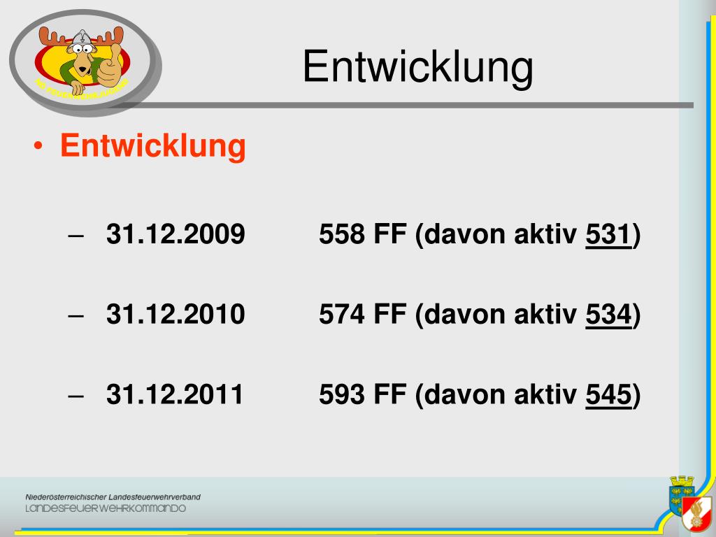 Entwicklung • Entwicklung • 31.12.2009 558 FF (davon aktiv 531) • 31.12.2010 574 FF (davon aktiv 534) • 31.12.2011 593 FF (davon aktiv 545)