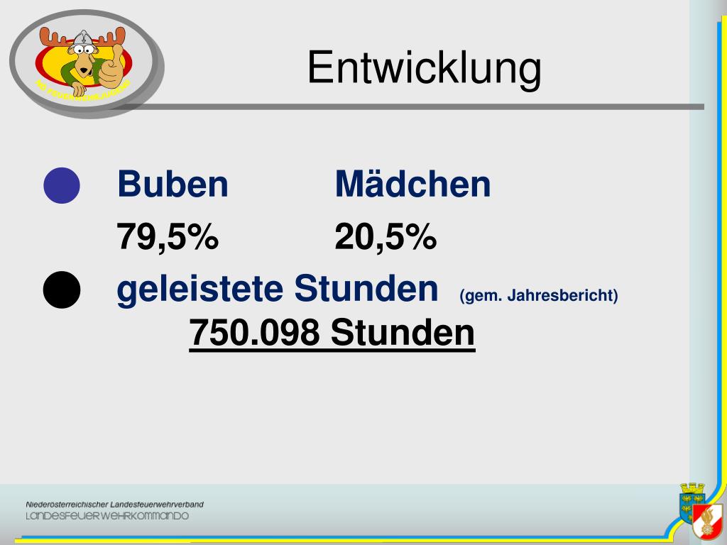 Entwicklung • Entwicklung • 31.12.2010 • 4741 Feuerwehrjugendmitglieder • 3771 Burschen (80%) • 970 Mädchen (20%) • 31.12.2011 • 4659 Feuerwehrjugendmitglieder • 3706 Burschen (79,5%) • 953 Mädchen (20,5%)