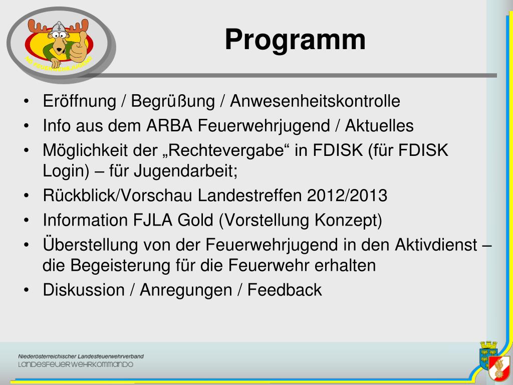 Programm • Eröffnung / Begrüßung / Anwesenheitskontrolle • Info aus dem ARBA Feuerwehrjugend / Aktuelles • Möglichkeit der „Rechtevergabe“ in FDISK (für FDISK Login) – für Jugendarbeit; • Rückblick/Vorschau Landestreffen 2012/2013 • Information FJLA Gold (Vorstellung Konzept) • Überstellung von der Feuerwehrjugend in den Aktivdienst– die Begeisterung für die Feuerwehr erhalten • Diskussion/ Anregungen / Feedback