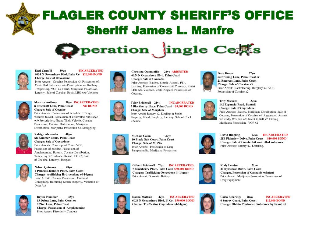 FLAGLER COUNTY SHERIFF’S OFFICE Sheriff James L. Manfre Karl Cranfill 59yo INCARCERATED 6024 N Oceanshore Blvd, Palm Cst$20,000 BOND Charge: Sale of Oxycodone Prior Arrests: Cocaine Possession x3, Possession of Controlled Substance w/o Prescription x4, Robbery, Trespassing, VOP x4, Fraud, Marijuana Possession, Larceny, Sale of Cocaine, Resist LEO w/o Violence Christina Quintanilla 24yo ARRESTED 6024 N Oceanshore Blvd, Palm Coast Charge: Sale of Cannabis Prior Arrests: Battery, Simple Assault, FTA, Larceny, Possession of Counterfeit Currency, Resist LEO w/o Violence, Child Neglect, Possession of Cocaine, Dave Downs 27yo 62 Bruning Lane, Palm Coast or 21 Empress Lane, Palm Coast Charge: Sale of Cocaine x3 Prior Arrest: Racketeering, Burglary x2, VOP, Possession of Cocaine x2 Troy Mickens 33yo 142 Espanola Road, Bunnell Charge:Sale of Oxycodone Prior Arrests: Battery, Marijuana Distribution, Sale of Cocaine, Possession of Cocaine x4, Aggravated Assault w/Deadly Weapon w/o Intent to Kill x2, Fleeing, Marijuana Possession, VOP x2 Maurice Anthony 30yo INCARCERATED 8 Rosecroft Lane, Palm Coast NO BOND Charge: Sale of Cocaine Prior Arrests: Possession of Schedule II Drugs w/Intent to Sell, Possession of Controlled Substance w/o Prescription, Grand Theft Vehicle, Cocaine Possession, Cocaine Distribution, Marijuana Distribution, Marijuana Possession x2, Smuggling Tyler Bridewell 21yo INCARCERATED 7 Blackberry Place, Palm Coast $5,000 BOND Charge:Sale of Morphine Prior Arrest: Battery x2, Dealing in Stolen Property, Fraud, Burglary, Larceny, Sale of Crack Cocaine Raleigh Alexander 40yo 6B Zammer Court, Palm Coast Charge: Sale of Oxycodone Prior Arrests: Contempt of Court, VOP, Possession of cocaine, Possession of Amphetamine, Battery, Cocaine Distribution, Tampering w/Evidence, Resist LEO x2, Sale of Cocaine, Larceny, Trespass David Ringling 22yo INCARCERATED 21B Plainview Drive, Palm Coast $10,000 BOND Charge: Sale of Counterfeit controlled substance Prior Arrests: Battery x2, Loitering, Michael Colon 27yo 10 Black Oak Court, Palm Coast Charge: Sale of MDNA Prior Arrests: Possession of Drug Paraphernalia, Marijuana Possession, Gilbert Bridewell 70yo INCARCERATED 7 Blackberry Place, Palm Coast $50,000 BOND Charges: Trafficking Oxycodone (4-14gms) Prior Arrest: Domestic Battery KodyLemire 21yo 24 Rymshaw Drive, Palm Coast Charge:, Possession of Cannabis w/Intent Prior Arrest: Marijuana Possession, Possession of Drug Equipment Nelson Quinones 48yo 4 Princess Jennifer Place, Palm Coast Charges: trafficking Hydrocodone (4-14gms) Prior Arrest: Cocaine Possession, Criminal Conspiracy, Receiving Stolen Property, Violation of Drug Act Bryan Plummer 43yo 13 Debra Lane, Palm Coast or 9 Zinc Lane, Palm Coast Charge: Possession of Amphetamine Prior Arrest: Disorderly Conduct Carla Etheridge 28yo INCARCERATED 6 Surrey Court, Palm Coast $12,000 BOND Charge: Obtain Controlled Substance by Fraud x6 Donna Mattson 42yo INCARCERATED 6024 N Oceanshore Blvd, Pl Cst$50,000 BOND Charge: Trafficking Oxycodone (4-14gms)
