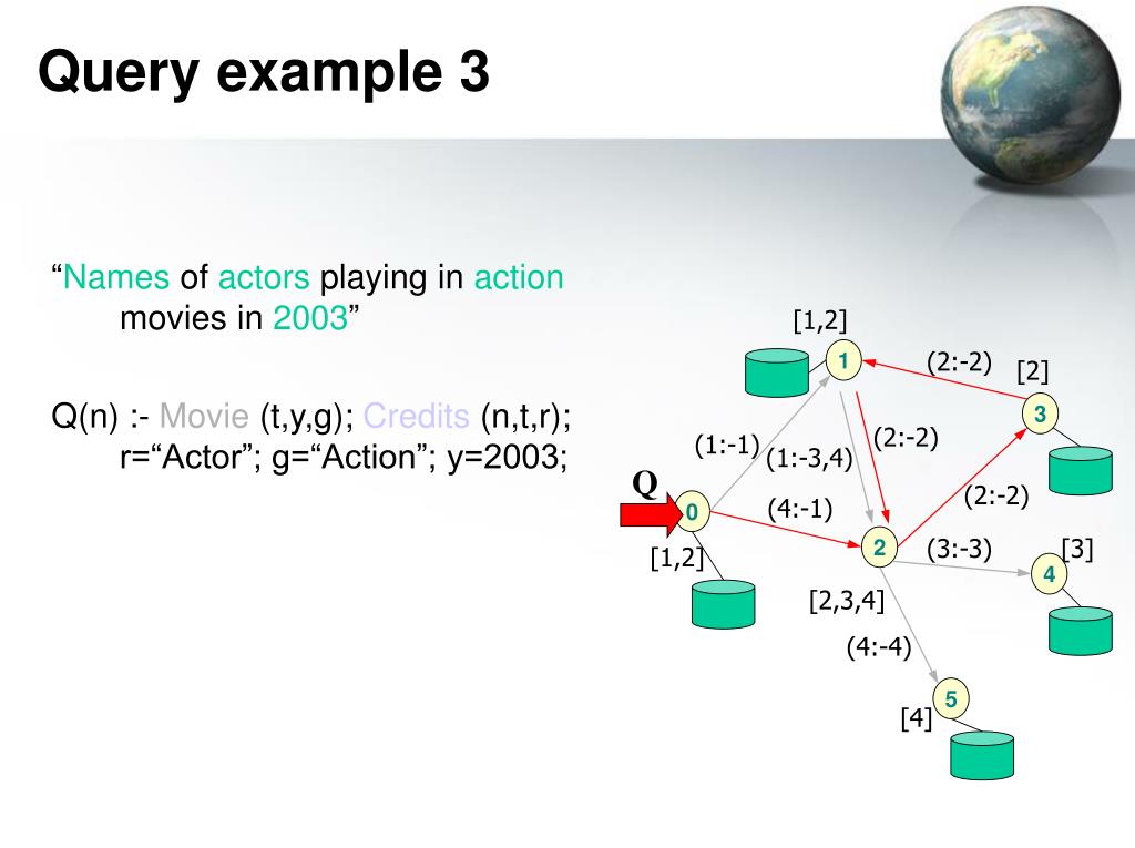 Query example 1 “List titles of movies featuring Tom Hanks” Q(t) :- Credits (n,t,r); n=“Tom Hanks” [1,2] 1 (2:-2) [2] 3 (2:-2) (1:-1) (1:-3,4) Q (2:-2) (4:-1) 0 2 (3:-3) [3] [1,2] (2:-2) 4 [2,3,4] (4:-4) 5 [4]