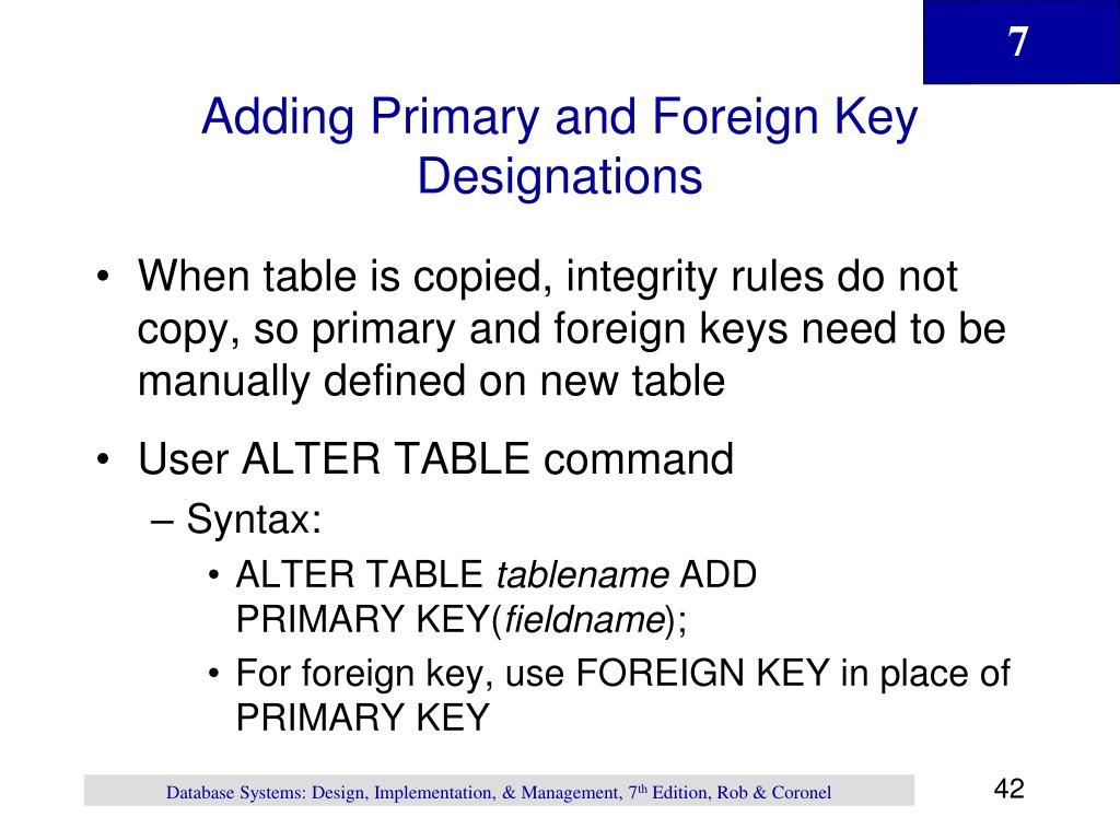 Adding Primary and Foreign Key Designations • When table is copied, integrity rules do not copy, so primary and foreign keys need to be manually defined on new table • User ALTER TABLE command • Syntax: • ALTER TABLE tablename ADD PRIMARY KEY(fieldname); • For foreign key, use FOREIGN KEY in place of PRIMARY KEY Database Systems: Design, Implementation, & Management, 7th Edition, Rob & Coronel