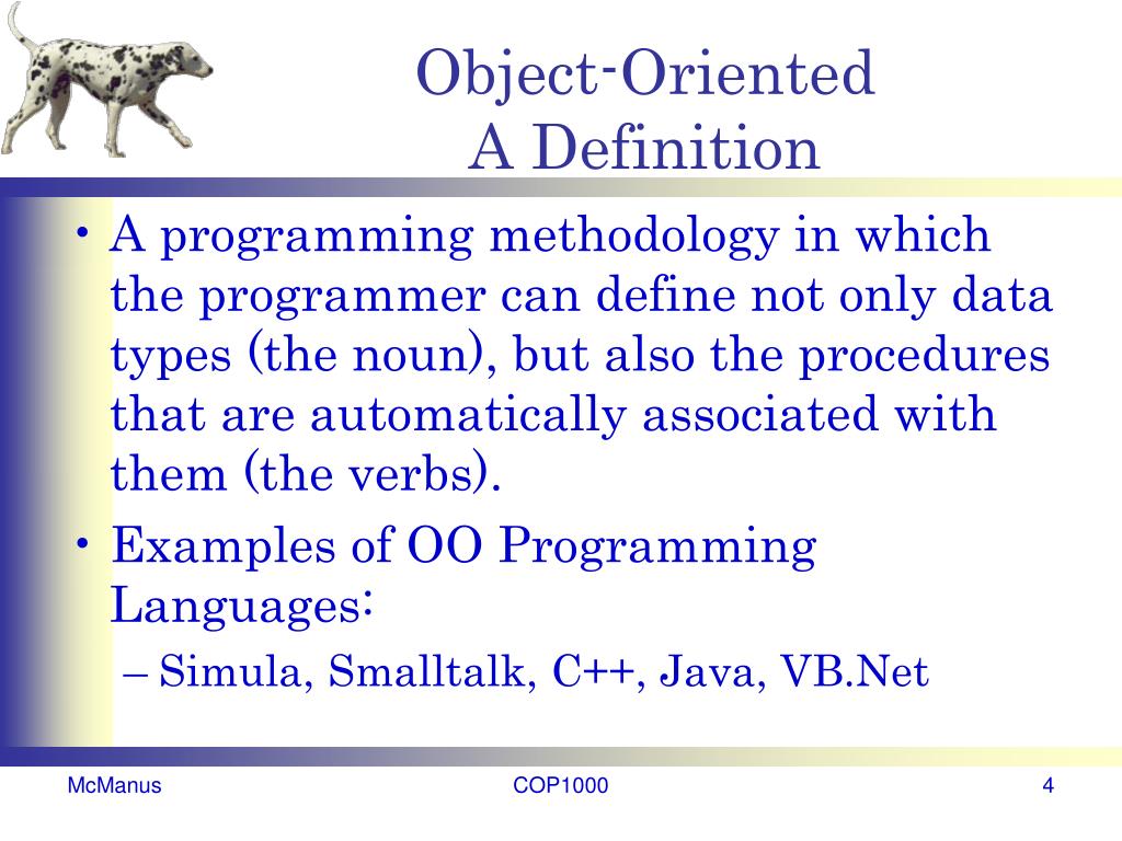 Object-Oriented A Definition • A programming methodology in which the programmer can define not only data types (the noun), but also the procedures that are automatically associated with them (the verbs). • Examples of OO Programming Languages: • Simula, Smalltalk, C++, Java, VB.Net COP1000