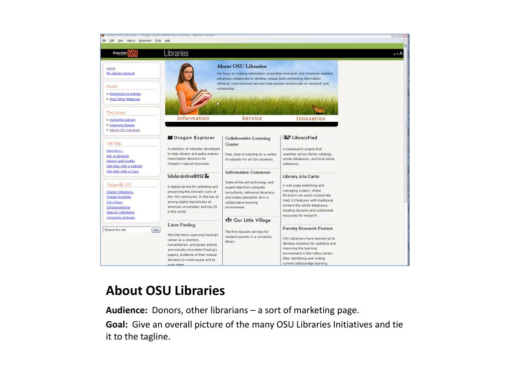 About OSU Libraries Audience: Donors, other librarians – a sort of marketing page. Goal: Give an overall picture of the many OSU Libraries Initiatives and tie it to the tagline.
