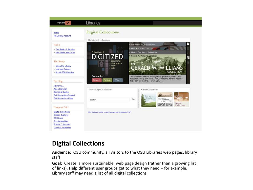 Digital Collections Audience: OSU community, all visitors to the OSU Libraries web pages, library staff Goal: Create a more sustainable web page design (rather than a growing list of links). Help different user groups get to what they need – for example, Library staff may need a list of all digital collections