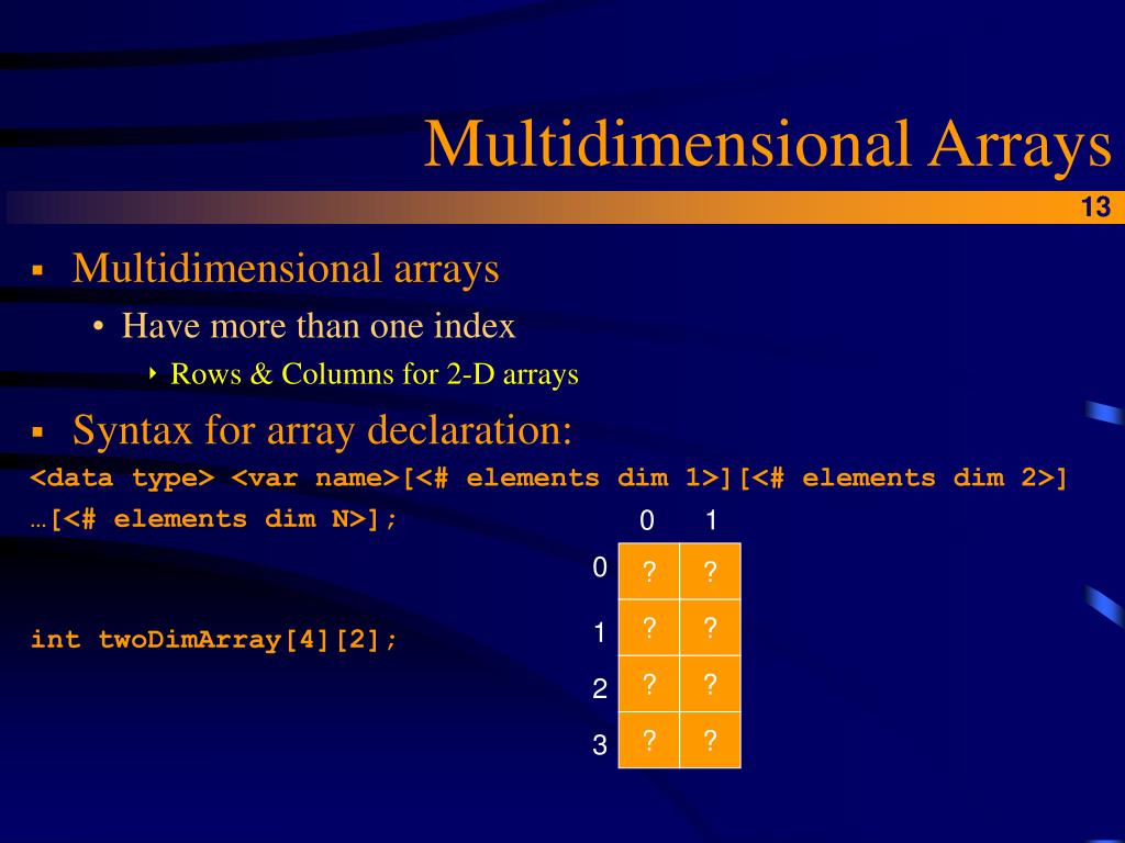 Multidimensional Arrays • Multidimensional arrays • Have more than one index • Rows & Columns for 2-D arrays • Syntax for array declaration: <data type> <var name>[<# elements dim 1>][<# elements dim 2>] …[<# elements dim N>]; int twoDimArray[4][2]; 0 1 0 ? ? ? ? 1 ? ? 2 ? ? 3