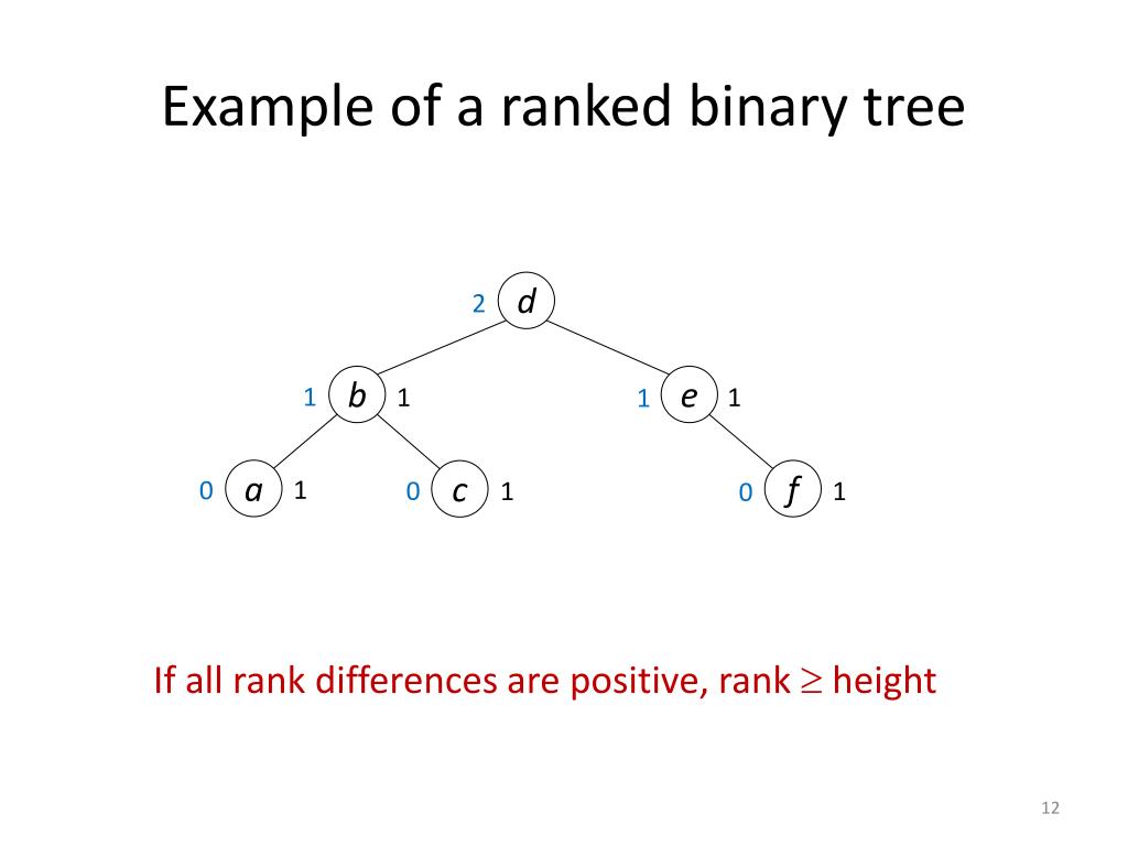 Example of a ranked binary tree d 2 b e 1 1 1 1 a f c 1 0 0 1 1 0 If all rank differences are positive, rank height