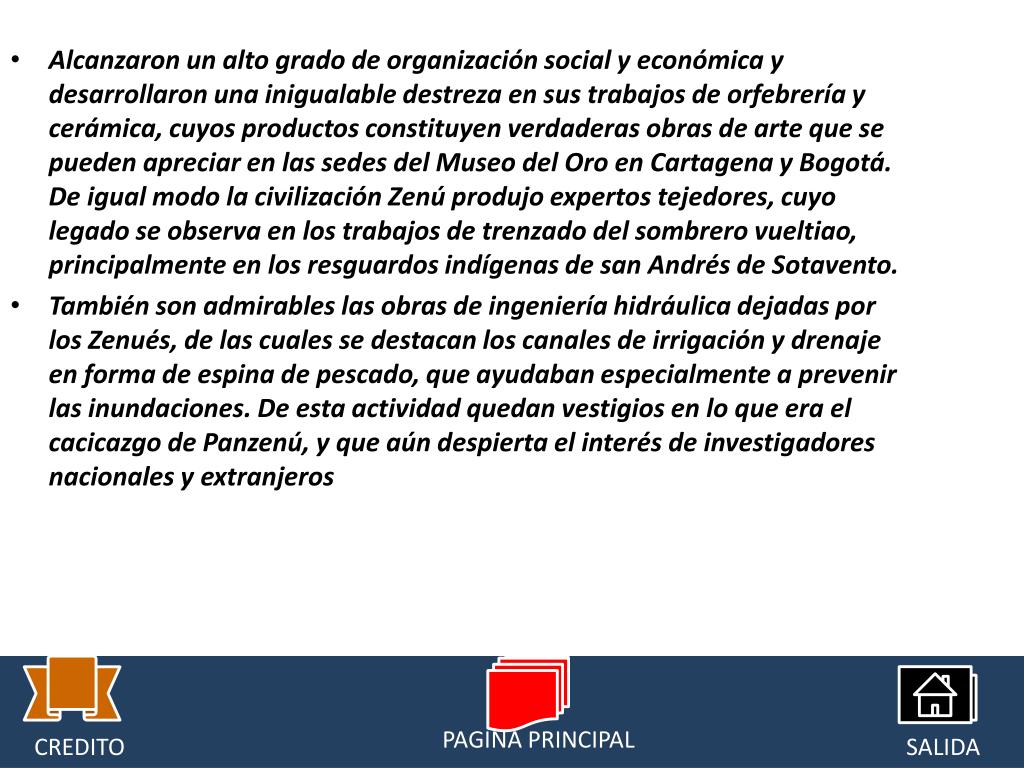 Alcanzaron un alto grado de organización social y económica y desarrollaron una inigualable destreza en sus trabajos de orfebrería y cerámica, cuyos productos constituyen verdaderas obras de arte que se pueden apreciar en las sedes del Museo del Oro en Cartagena y Bogotá. De igual modo la civilización Zenú produjo expertos tejedores, cuyo legado se observa en los trabajos de trenzado del sombrero vueltiao, principalmente en los resguardos indígenas de san Andrés de Sotavento. También son admirables las obras de ingeniería hidráulica dejadas por los Zenués, de las cuales se destacan los canales de irrigación y drenaje en forma de espina de pescado, que ayudaban especialmente a prevenir las inundaciones. De esta actividad quedan vestigios en lo que era el cacicazgo de Panzenú, y que aún despierta el interés de investigadores nacionales y extranjeros PAGINA PRINCIPAL CREDITO SALIDA
