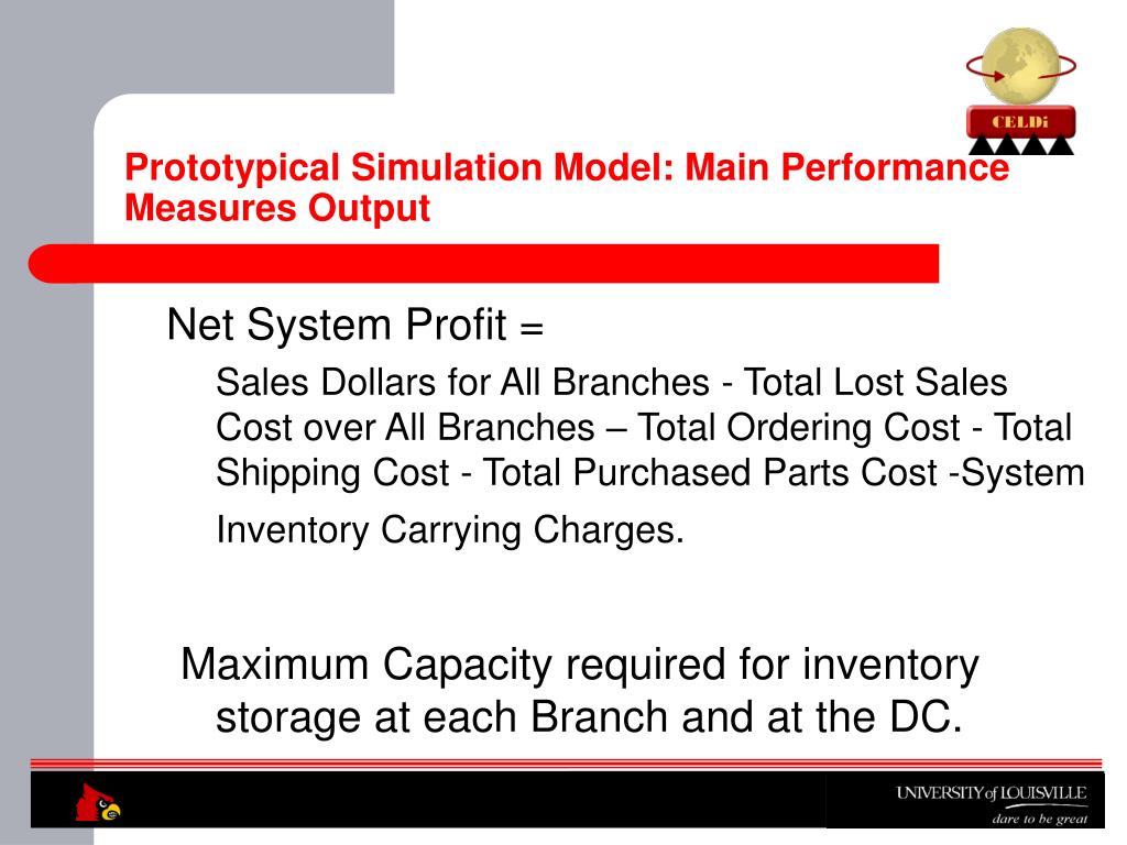 Prototypical Simulation Model: Main Performance Measures Output Net System Profit = Sales Dollars for All Branches - Total Lost Sales Cost over All Branches – Total Ordering Cost - Total Shipping Cost - Total Purchased Parts Cost -System Inventory Carrying Charges. Maximum Capacity required for inventory storage at each Branch and at the DC.