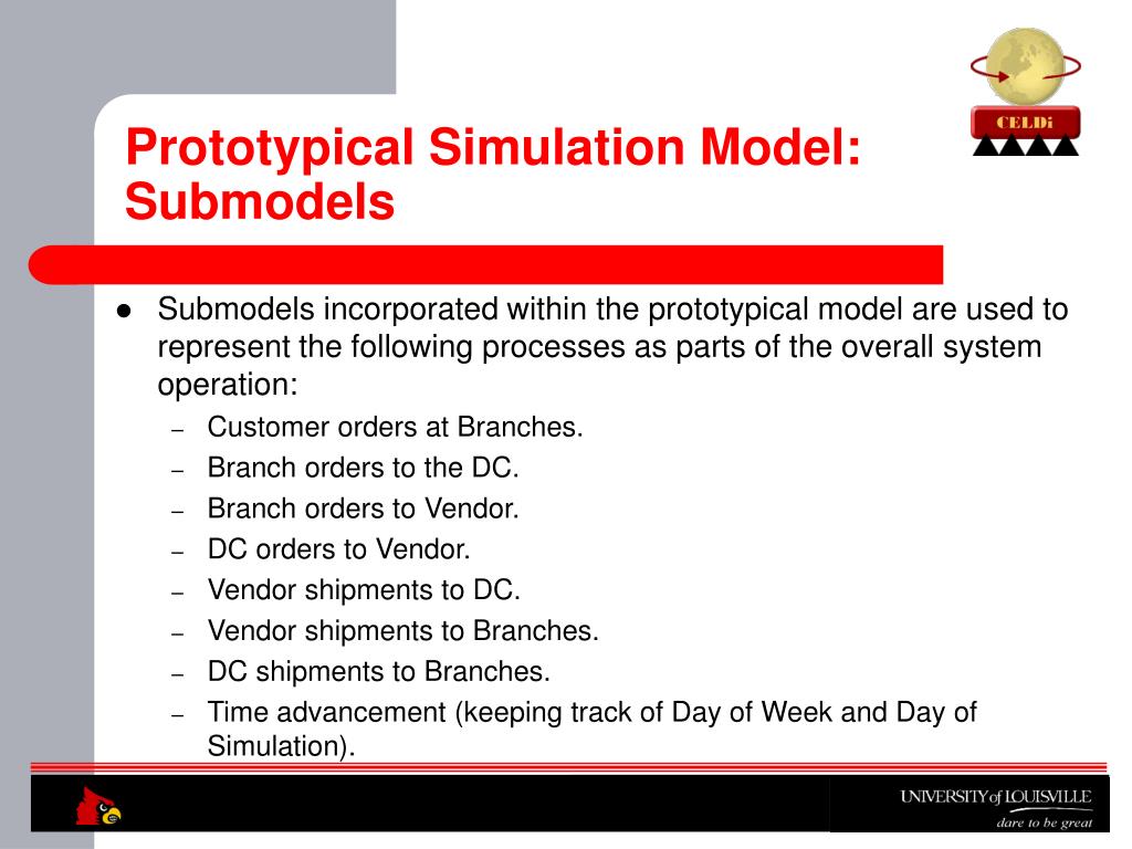 Prototypical Simulation Model: Submodels • Submodels incorporated within the prototypical model are used to represent the following processes as parts of the overall system operation: • Customer orders at Branches. • Branch orders to the DC. • Branch orders to Vendor. • DC orders to Vendor. • Vendor shipments to DC. • Vendor shipments to Branches. • DC shipments to Branches. • Time advancement (keeping track of Day of Week and Day of Simulation).