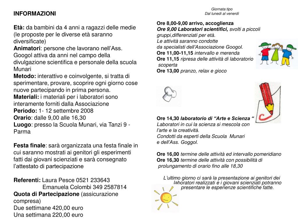 INFORMAZIONI Età: da bambini da 4 anni a ragazzi delle medie (le proposte per le diverse età saranno diversificate) Animatori: persone che lavorano nell’Ass. Googol attiva da anni nel campo della divulgazione scientifica e personale della scuola Munari Metodo: interattivo e coinvolgente, si tratta di sperimentare, provare, scoprire ogni giorno cose nuove partecipando in prima persona. Materiali: i materiali per i laboratori sono interamente forniti dalla Associazione Periodo: 1- 12 settembre 2008 Orario: dalle 9,00 alle 16,30 Luogo: presso la Scuola Munari, via Tanzi 9 - Parma Festa finale: sarà organizzata una festa finale in cui saranno mostrati ai genitori gli esperimenti fatti dai giovani scienziati e sarà consegnato l’attestato di partecipazione Referenti: Laura Pesce 0521 233643 Emanuela Colombi 349 2587814 Quota di Partecipazione (assicurazione compresa) Due settimane 420,00 euro Una settimana 220,00 euro Giornata tipo Dal lunedì al venerdì Ore 8,00-9,00 arrivo, accoglienza Ore 9,00Laboratori scientifici, svolti a piccoli gruppi,differenziati per età. Le attività saranno condotte da specialisti dell’Associazione Googol. Ore 11,00-11,15intervallo e merenda Ore 11,15ripresa delle attività di laboratorio e scoperta Ore 13,00pranzo, relax e gioco Ore 14,30laboratorio di “Arte e Scienza “ Laboratori in cui la scienza si mescola con l’arte e la creatività. Condotti da esperti della Scuola Munari e dell’Ass. Goggol. Ore 16,00termine delle attività ed intervallo pomeridiano Ore 16,30termine delle attività con possibilità di prolungamento di orario fino alle 18,30 L’ultimo giorno ci sarà la presentazione ai genitori dei laboratori realizzati e i giovani scienziati potranno presentare le esperienze scientifiche fatte.