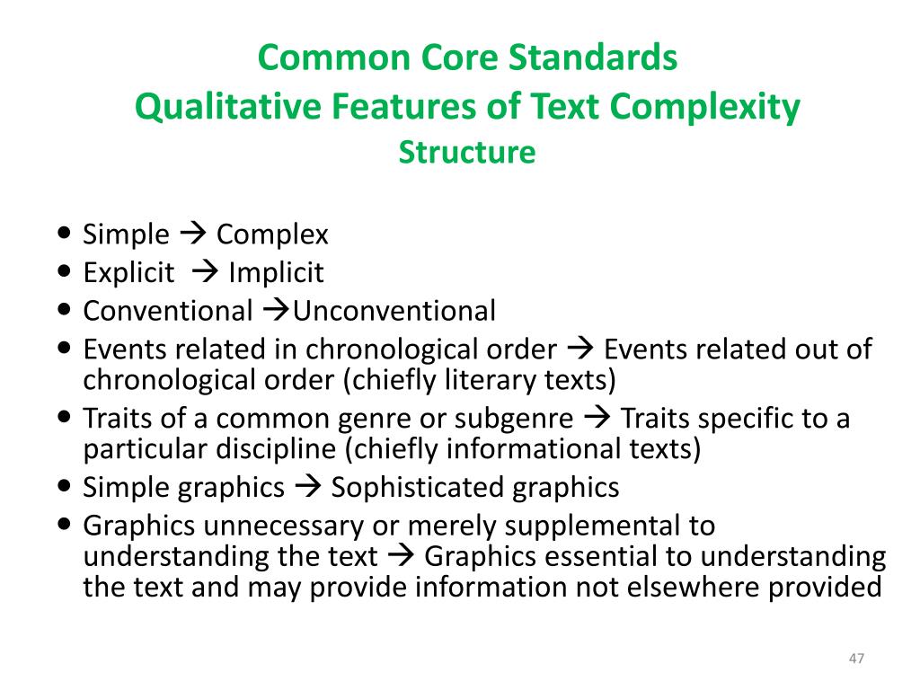 Common Core StandardsQualitative Features of Text ComplexityStructure • Simple Complex • Explicit Implicit • Conventional Unconventional • Events related in chronological order Events related out of chronological order (chiefly literary texts) • Traits of a common genre or subgenre Traits specific to a particular discipline (chiefly informational texts) • Simple graphics Sophisticated graphics • Graphics unnecessary or merely supplemental to understanding the text Graphics essential to understanding the text and may provide information not elsewhere provided