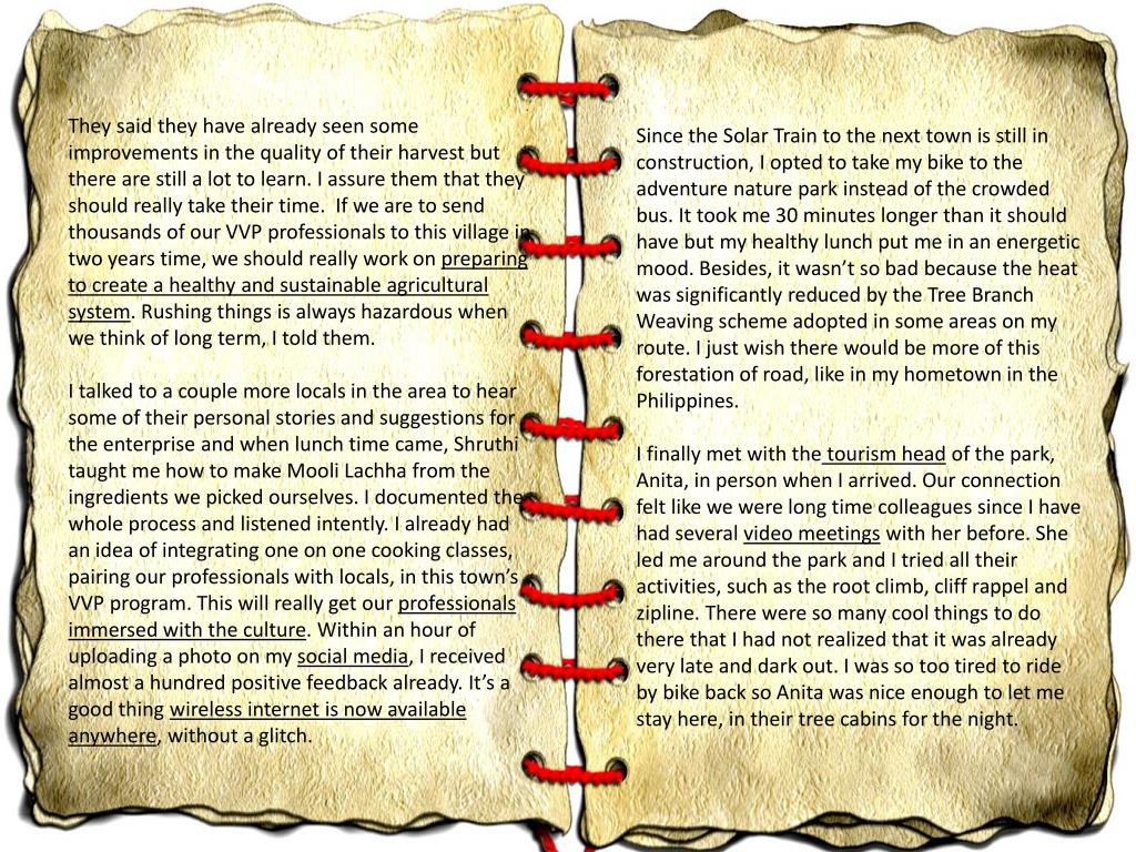 A Day in My Dream Job Good thing I had a fantastic view, the backdrop of soothing waves and fresh Kachumber to keep me company all day. I have managed to finish all the work so I could do my usual rounds of the village and visit the popular adventure nature park in the neighboring town for more ‘research’, aka fun time for me. I rode my bike to the nearby organic farm and saw that Prashant and Shruthi, two of the local farmers, was already hard at work in the tomato garden. My, how their tomatoes have grown! No wonder yesterday’s Kachumber was that juicy. I set to work with them, attending to the produce, while I do my routine consultation about how they applied what they have learned through the sustainable agriculture online class that my company has enrolled them in. I must say I really like this kind of discussions, where we are embraced by nature, unlike my concrete world in my job 10 years ago. September 26, 2022 Dear Diary, What an exciting day it has been! This job of mine as a VVP Developer really keeps me on my toes, but it is all worth it. I can’t believe I am really staying here in a beautiful and well preserved beach in India for 3 months. To think, just two months ago I was enjoy crispy tomatokeftes in breezy Santorini, and now I’m in an interesting new setting. This doesn’t feel like work at all! This morning I woke up at 7AM, an hour earlier than my usual wake time, because a curious yellow bird happened to wander into my resort window to give me a morning claw to the forehead. I didn’t really mind it the since I had a chance to extend my usual morning jog along the pink shores. It was just the boost I needed after spending all day yesterday in the veranda of my nipa hut finishing reports and editing photos from the previous week.
