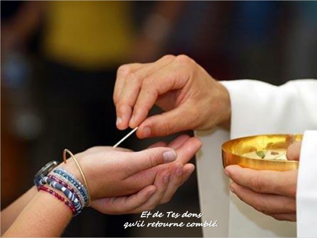 Reçois les chants qu'il offre à Ta gloire immortelle, Et de Tes dons qu'il retourne comblé.