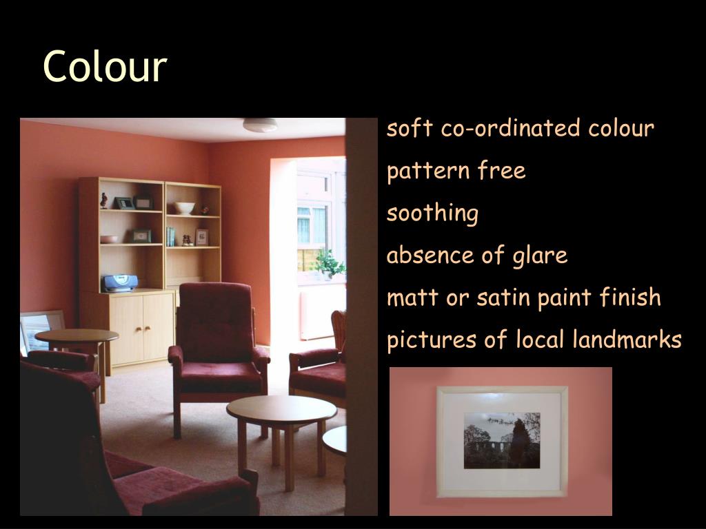 Colour soft co-ordinated colour pattern free soothing absence of glare matt or satin paint finish pictures of local landmarks