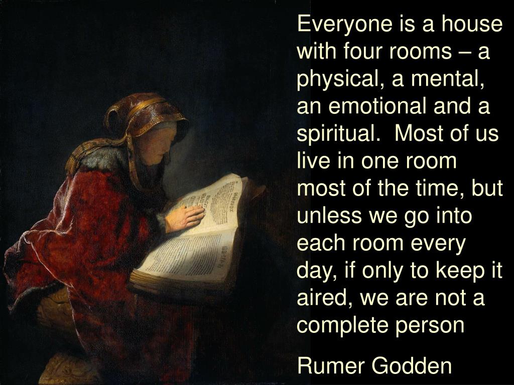 Everyone is a house with four rooms – a physical, a mental, an emotional and a spiritual. Most of us live in one room most of the time, but unless we go into each room every day, if only to keep it aired, we are not a complete person Rumer Godden