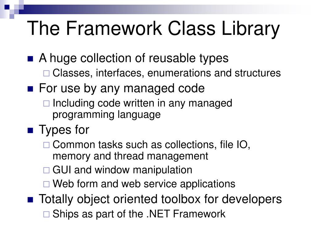 The Framework Class Library • A huge collection of reusable types • Classes, interfaces, enumerations and structures • For use by any managed code • Including code written in any managed programming language • Types for • Common tasks such as collections, file IO, memory and thread management • GUI and window manipulation • Web form and web service applications • Totally object oriented toolbox for developers • Ships as part of the .NET Framework