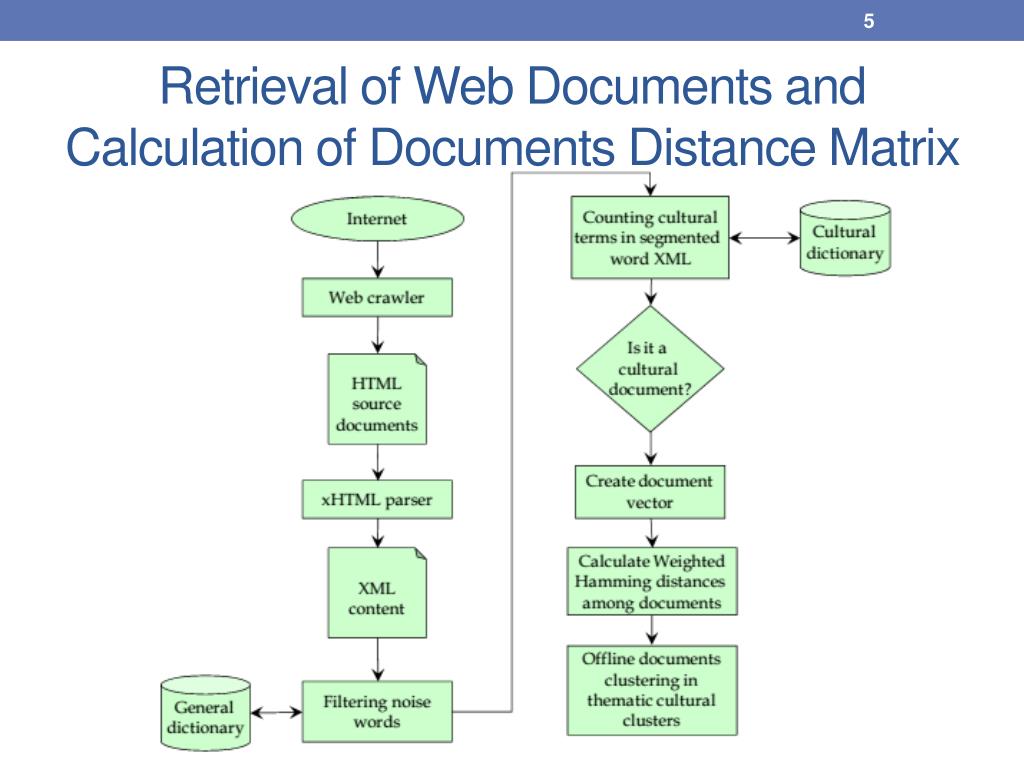 Introduction • Clustering • Refers to the assignment of a set of elements (documents) into subsets (clusters) so that elements in the same cluster are similar in some sense. • Purpose • The article introduces a novel focused crawler that extracts and process cultural data from the web • First phase: Surf the web • Second phase: WebPages are separated in different clusters depending on the thematic • Creation of Multidimensional document vector • Calculating the distance between the documents • Group by clusters