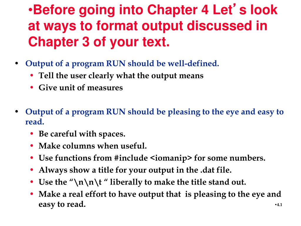 Before going into Chapter 4 Let ’ s look at ways to format output discussed in Chapter 3 of your text. Output of a program RUN should be well-defined. Tell the user clearly what the output means Give unit of measures Output of a program RUN should be pleasing to the eye and easy to read.