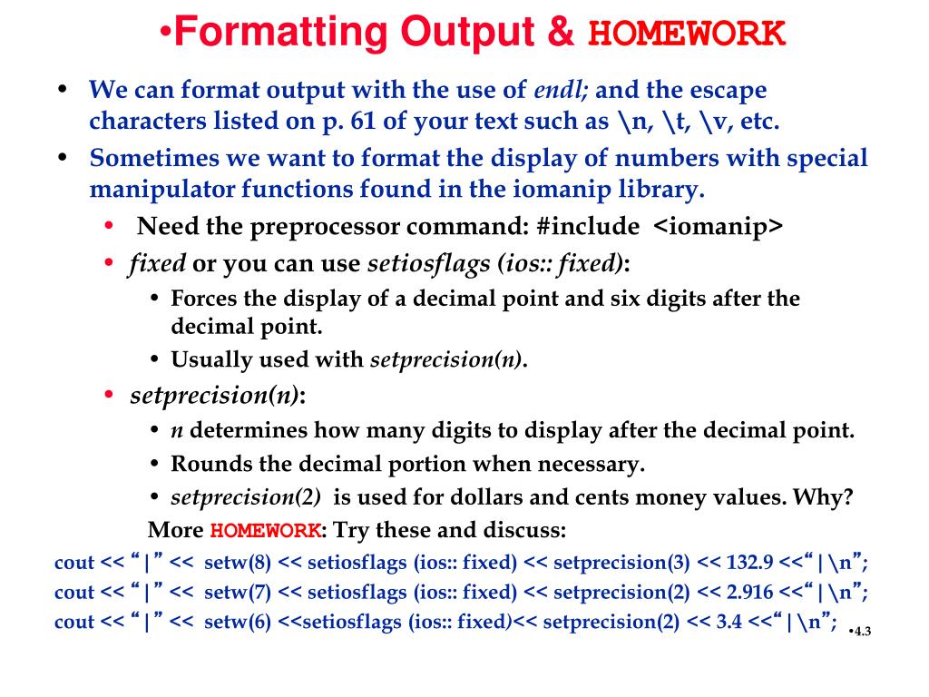 Formatting Output & HOMEWORK • We can format output with the use of endl; andthe escape characters listed on p. 61 of your text such as \n, \t, \v, etc. • Sometimes we want to format the display of numbers with special manipulator functions found in the iomanip library. • Remember the preprocessor command: #include <iomanip> • The manipulators setw(n), fixed, and setprecision(n) are the most commonly used, but there are more. See pp. 119-130 in your text. • More HOMEWORK: Do exercises 6 and 7 on p.130.