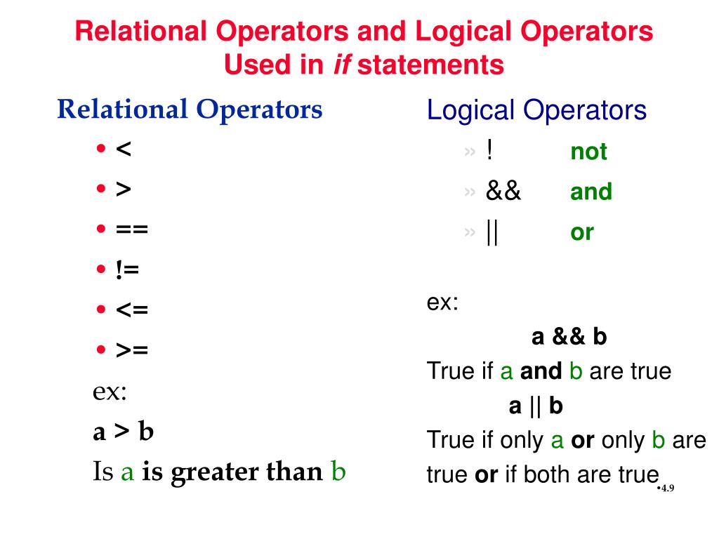Relational Operators < > == != <= >= ex: a > b Is aisgreater thanb Relational Operators and Logical OperatorsUsed in if statements • Logical Operators • ! not • && and • || or • ex: • a && b • True if aandb are true • a || b • True if only aor only b are • true or if both are true